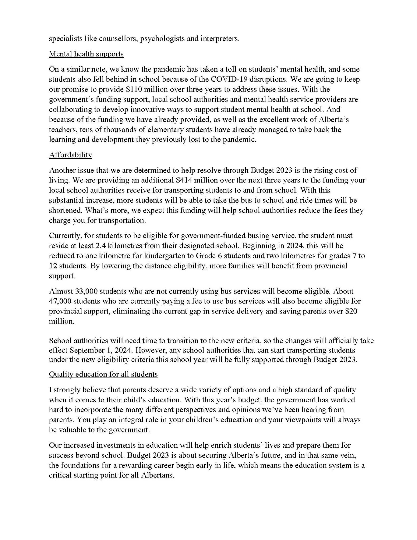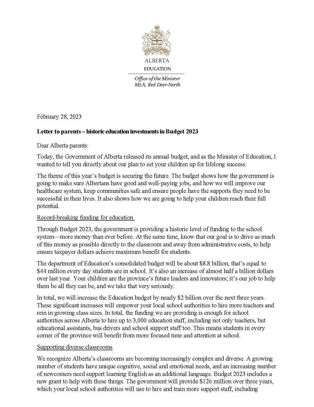 Letter from the Minister of Education, Adriana LaGrange - Feb 28, 2023